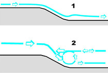 Un ralentissement du courant annonce le bief amont d’un barrage. Les barrages de conception ancienne peuvent se limiter à une chaussée ou un seuil. Ils fonctionnent par surversement et engendrent des