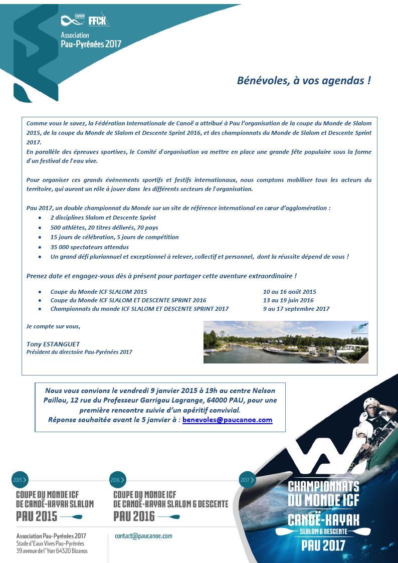 En 2017 se dérouleront à Pau les Championnats du Monde de Slalom et de Descente. De manière privilégiée et par anticipation, nous vous adressons la première information et l'invitation de Tony Estanguet.